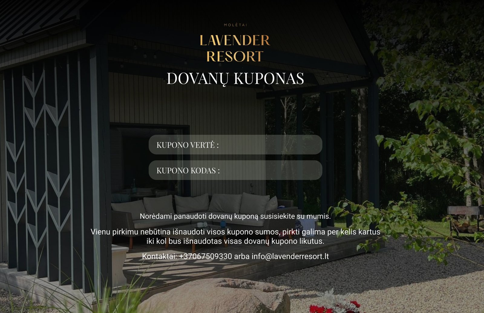 Ieškote dovanos, kuri išliktų atmintyje ilgai? Lavender Resort dovanų kuponas – tai galimybė padovanoti poilsį gamtos apsuptyje, ant ežero pakrantės. Tai dovana, kuri tinka gimtadieniui, vestuvėms, jubiliejui ar tiesiog norint pradžiuginti artimą žmogų ypatinga patirtimi.